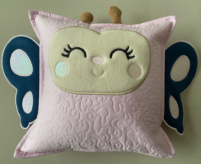 Almofada Borboleta estruturada com Manta R2, quilting, bordado eletrônico e com ziper.