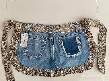 Avental confeccionado com a reutilização do jeans e tricoline 100% algodão.